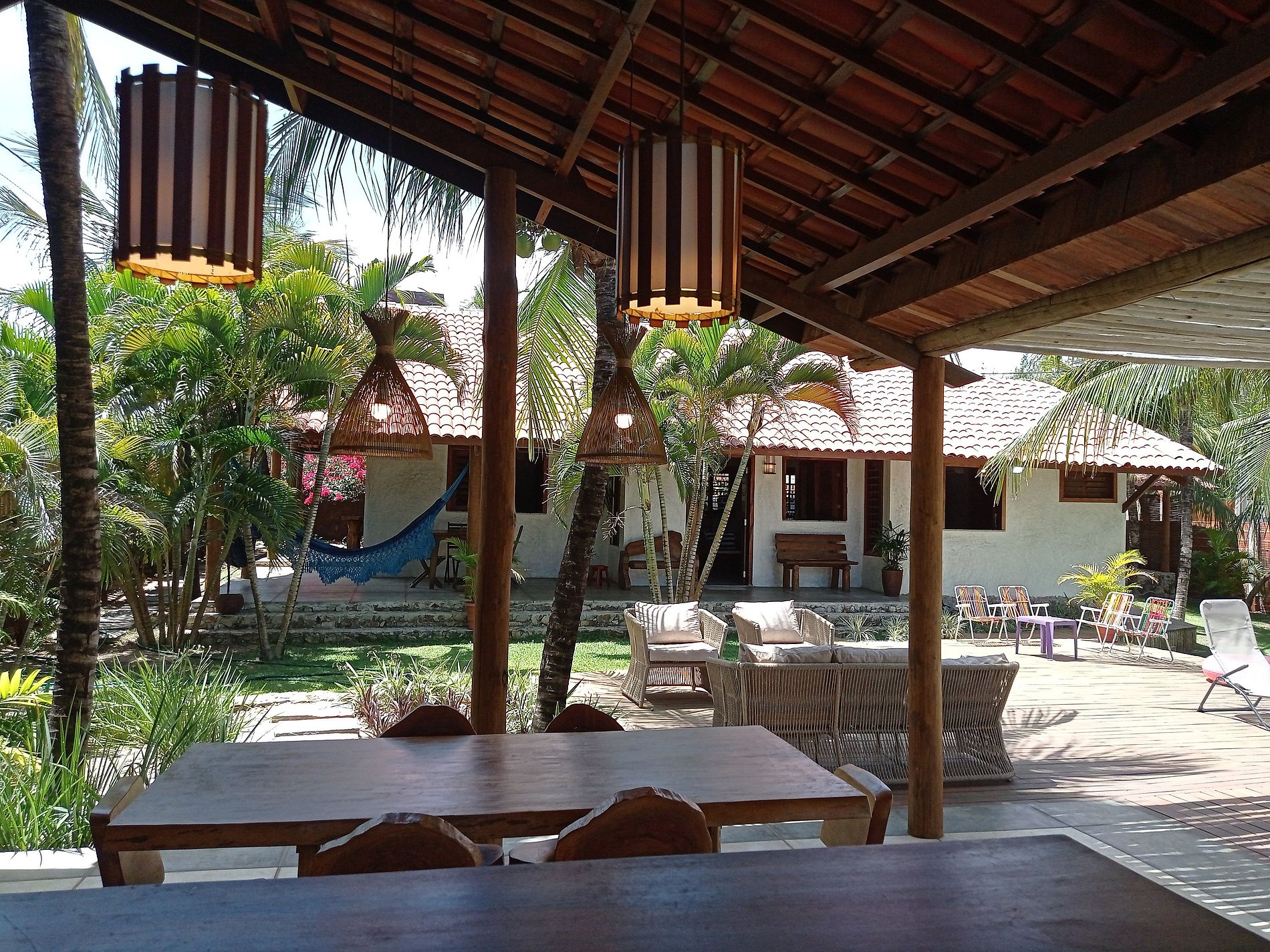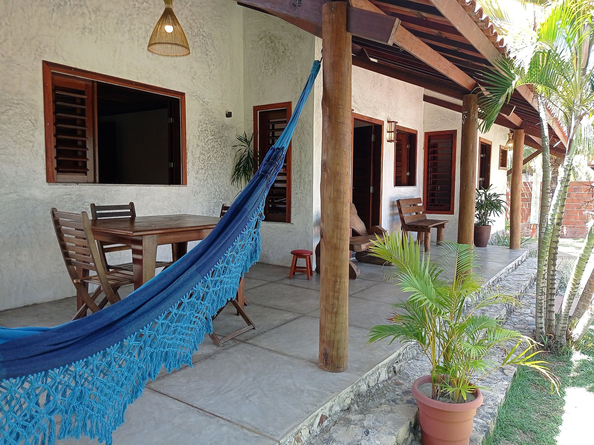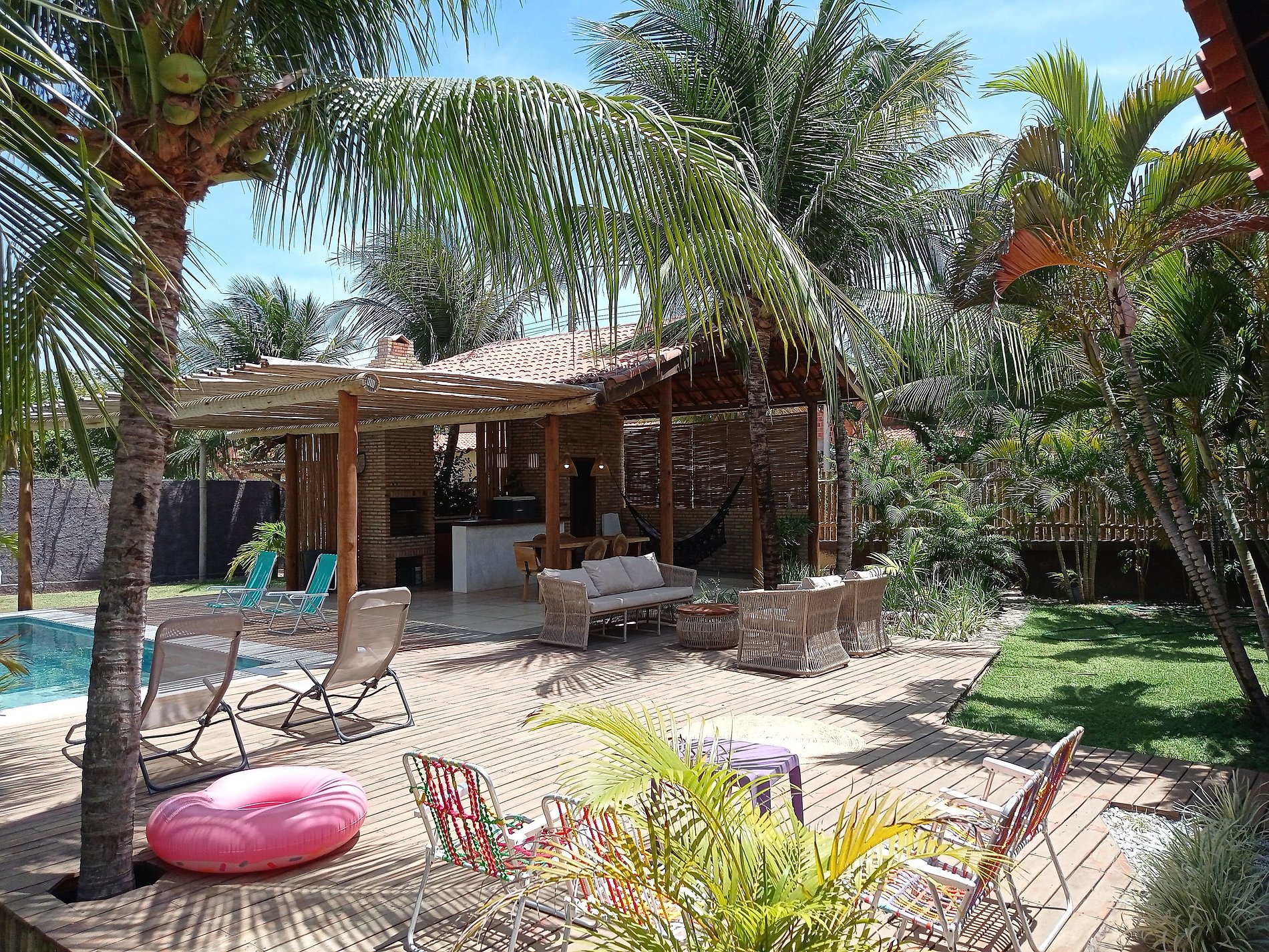 Recanto de praia no Morro do Chapéu, Taíba (São Gonçalo do Amarante), ideal para famílias. Quatro suítes (uma reversível) para até 9 pessoas, piscina com deck, varanda para redes, jardim arborizado, churrasqueira com bancada e mesa de madeira, ar-condicionado em todos os quartos, Wi-Fi e funcionária inclusa para auxiliar no café e almoço. Próximo ao pico de surf. Perfeita para relaxar e curtir com conforto e iluminação noturna.