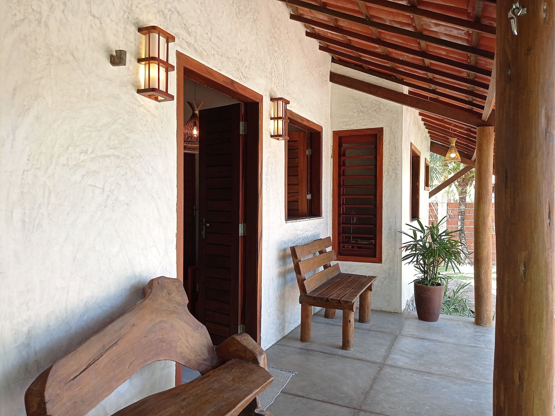 Iluminação externa pensada para criar atmosfera acolhedora à noite.