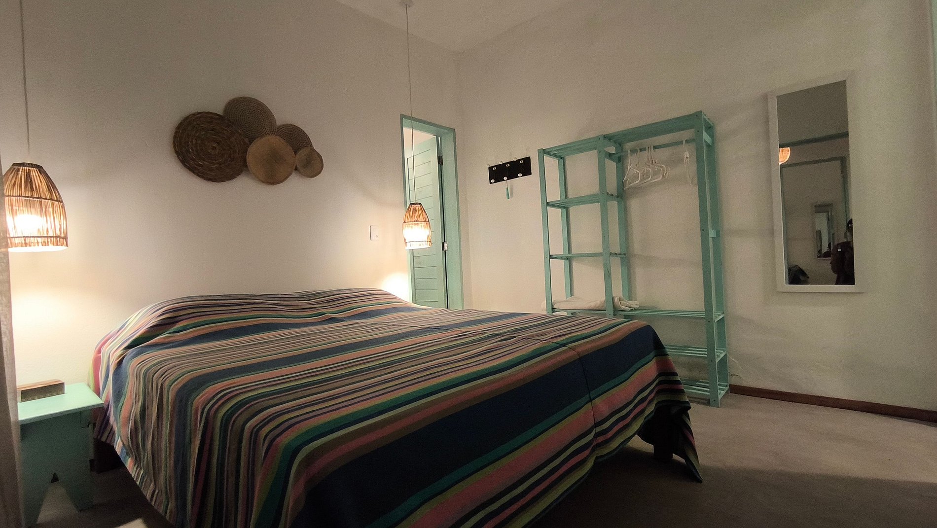 A Suíte 1 da Casa Almar oferece conforto e charme em uma casa pé na areia na Praia da Pesqueira, uma das áreas mais desejadas da Taíba. O quarto possui cama queen, ar-condicionado e chuveiro com água aquecida, garantindo o descanso ideal após um dia de mar e vento.