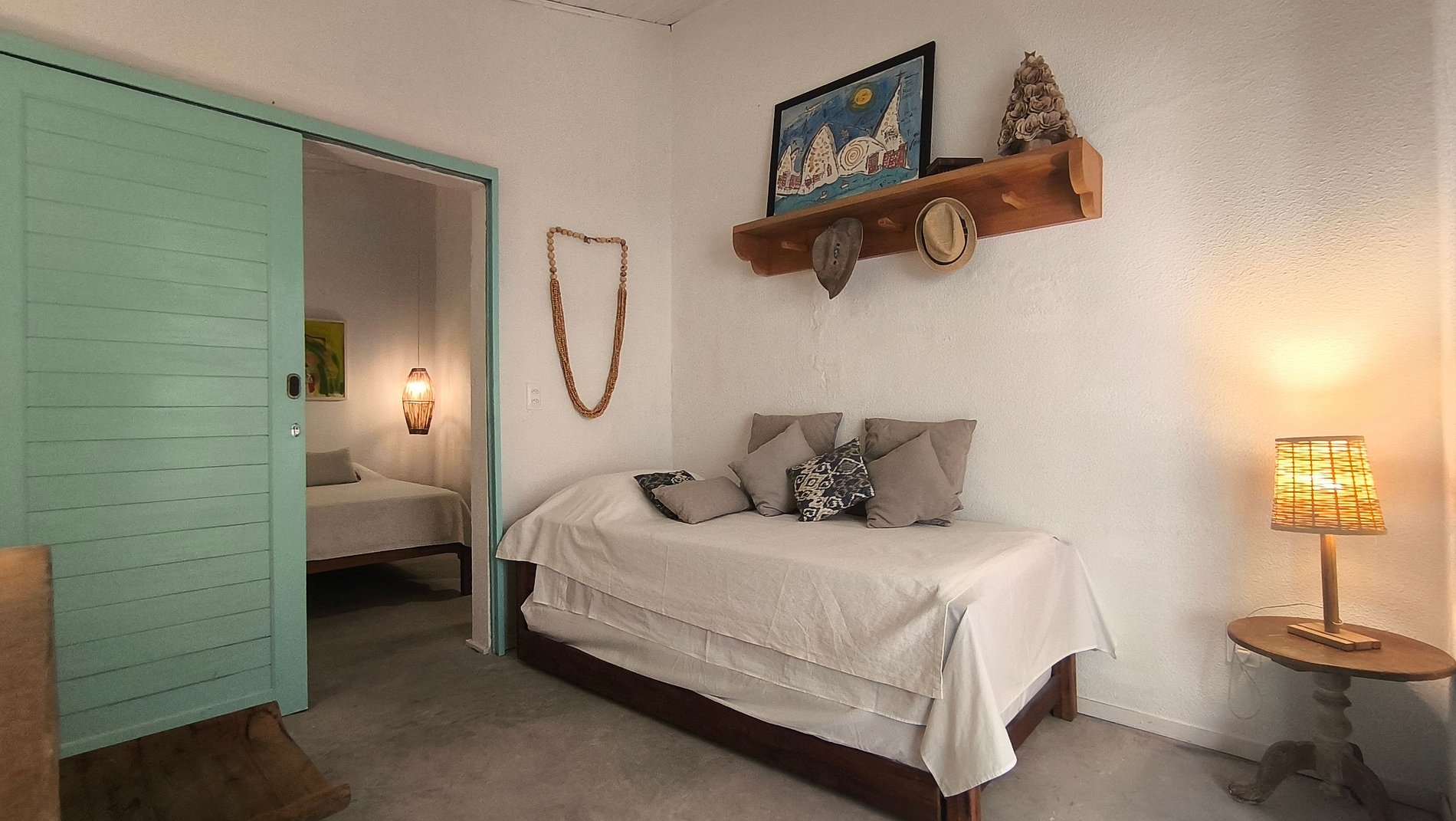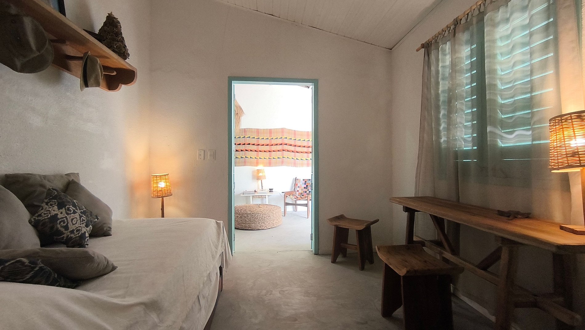 A Suíte 1 da Casa Almar oferece conforto e charme em uma casa pé na areia na Praia da Pesqueira, uma das áreas mais desejadas da Taíba. O quarto possui cama queen, ar-condicionado e chuveiro com água aquecida, garantindo o descanso ideal após um dia de mar e vento.