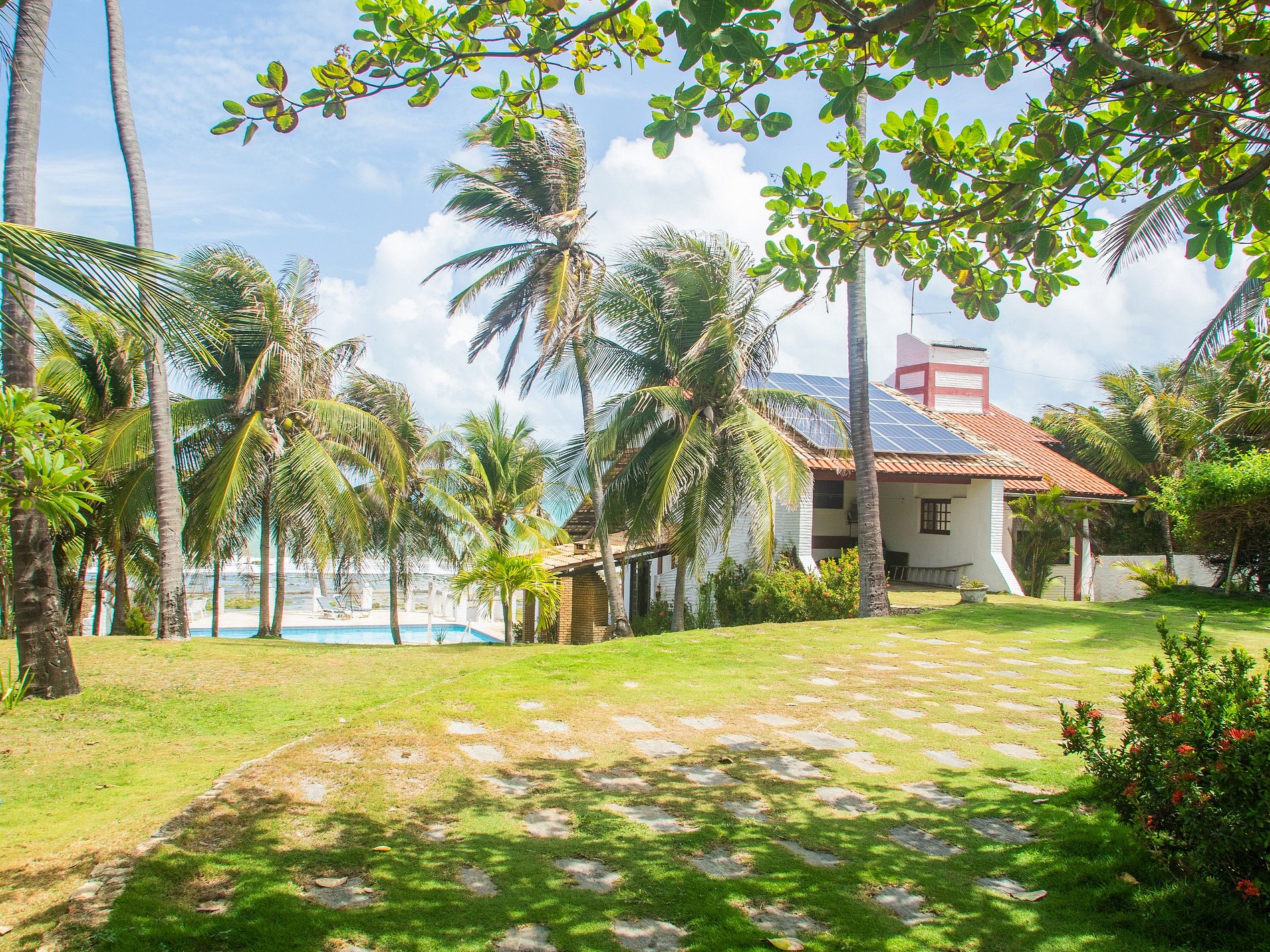 Beachfront house in the center of Taiba. Four bedrooms (2 suites), private pool, 1,700m² garden with parking for multiple vehicles. Only 10 meters from the beach. Air conditioning in all rooms.