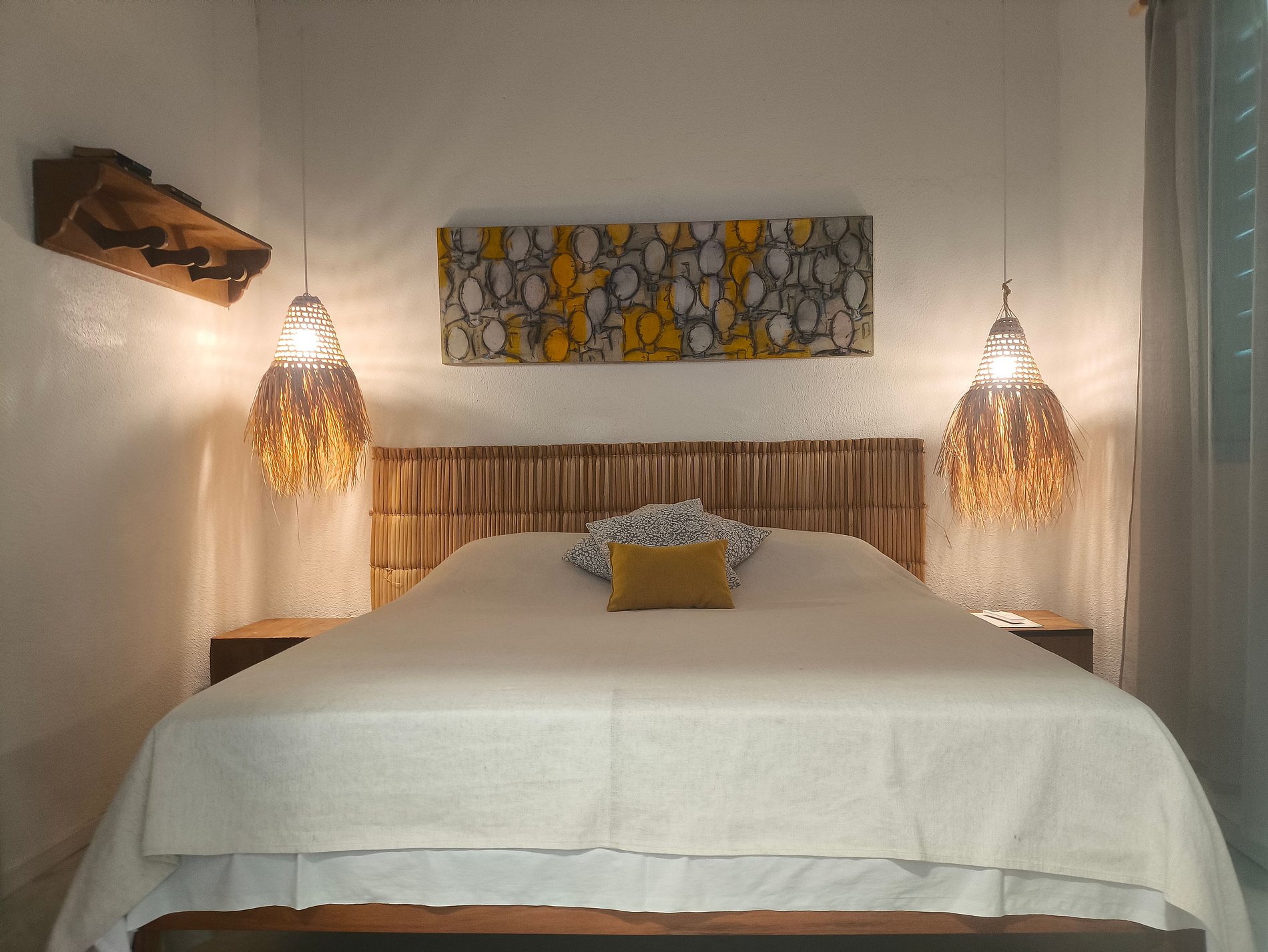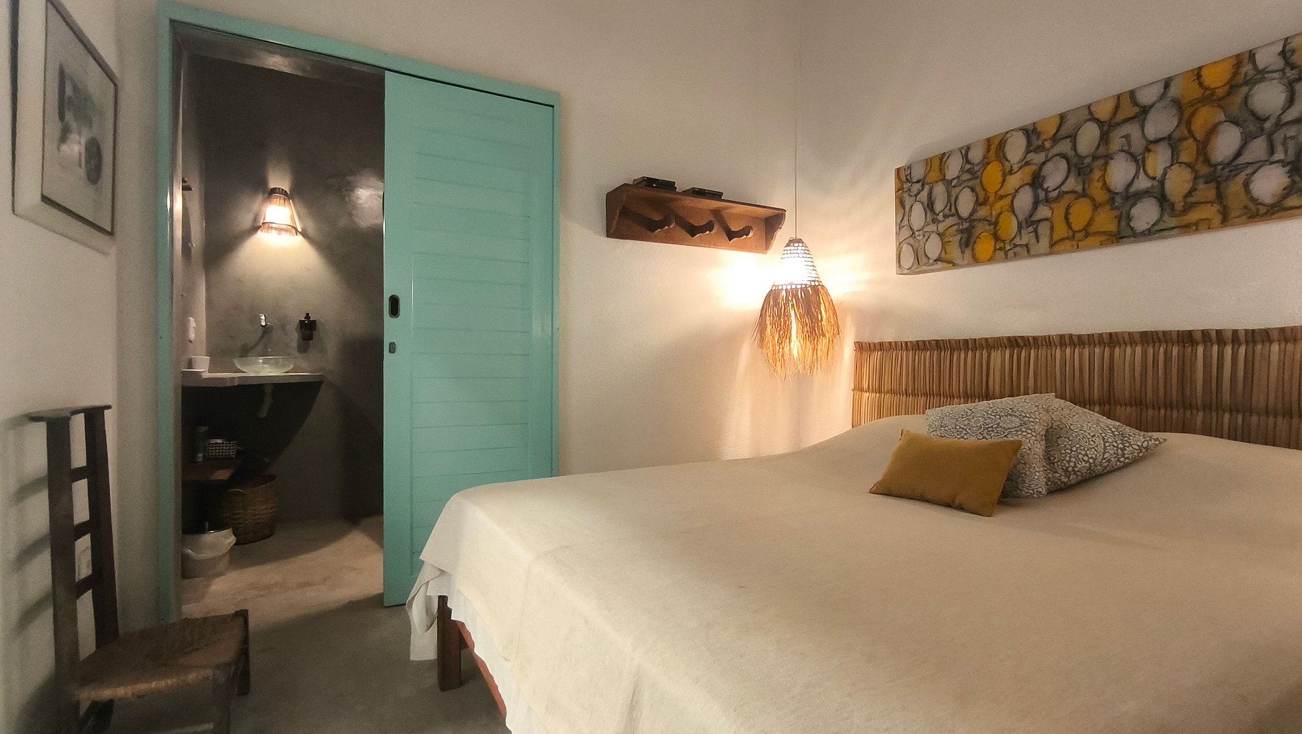 A Suíte 1 da Casa Almar oferece conforto e charme em uma casa pé na areia na Praia da Pesqueira, uma das áreas mais desejadas da Taíba. O quarto possui cama queen, ar-condicionado e chuveiro com água aquecida, garantindo o descanso ideal após um dia de mar e vento.