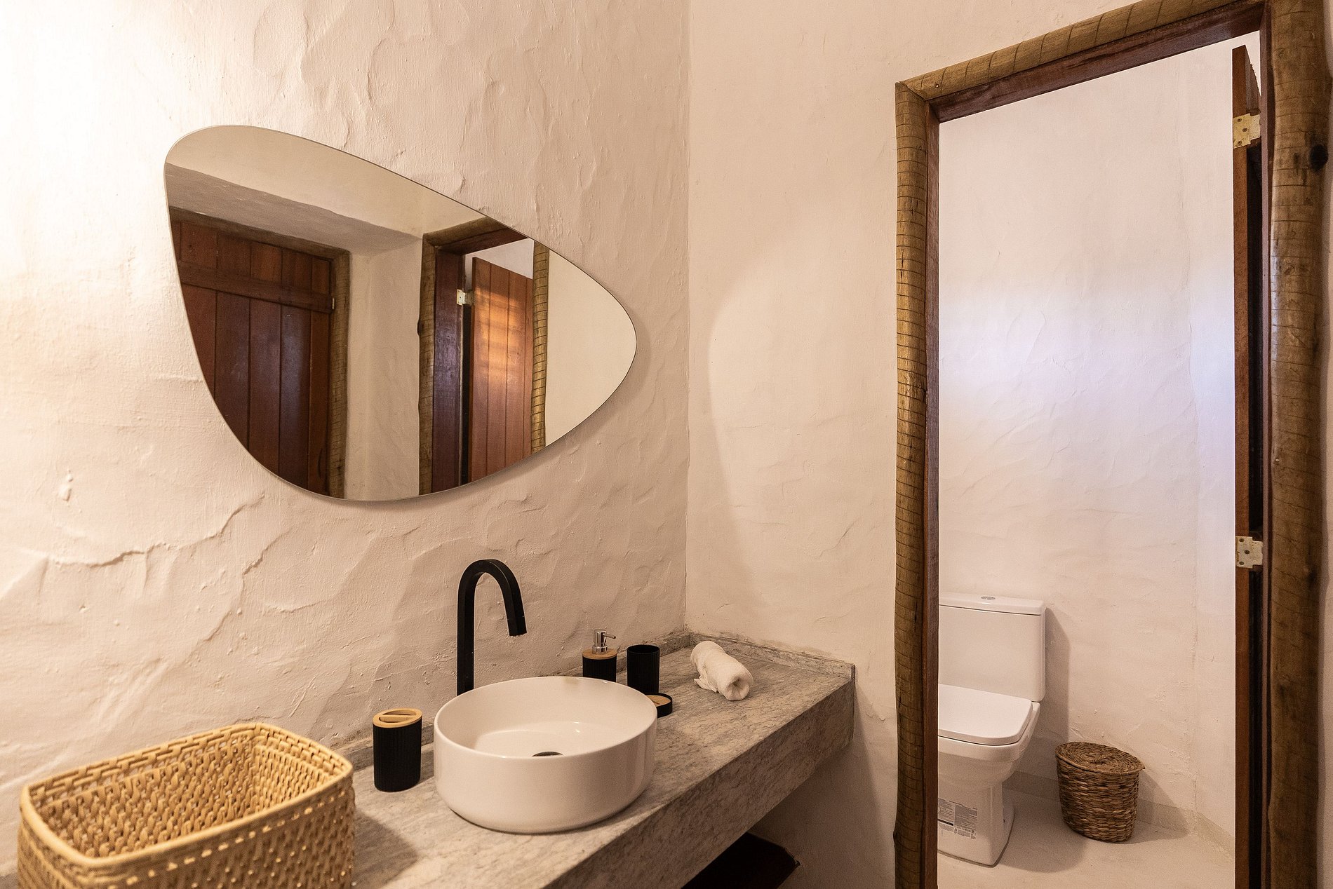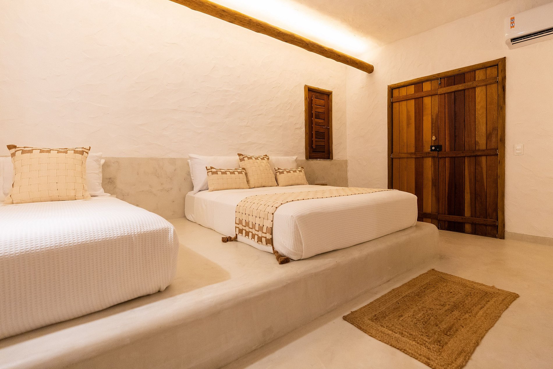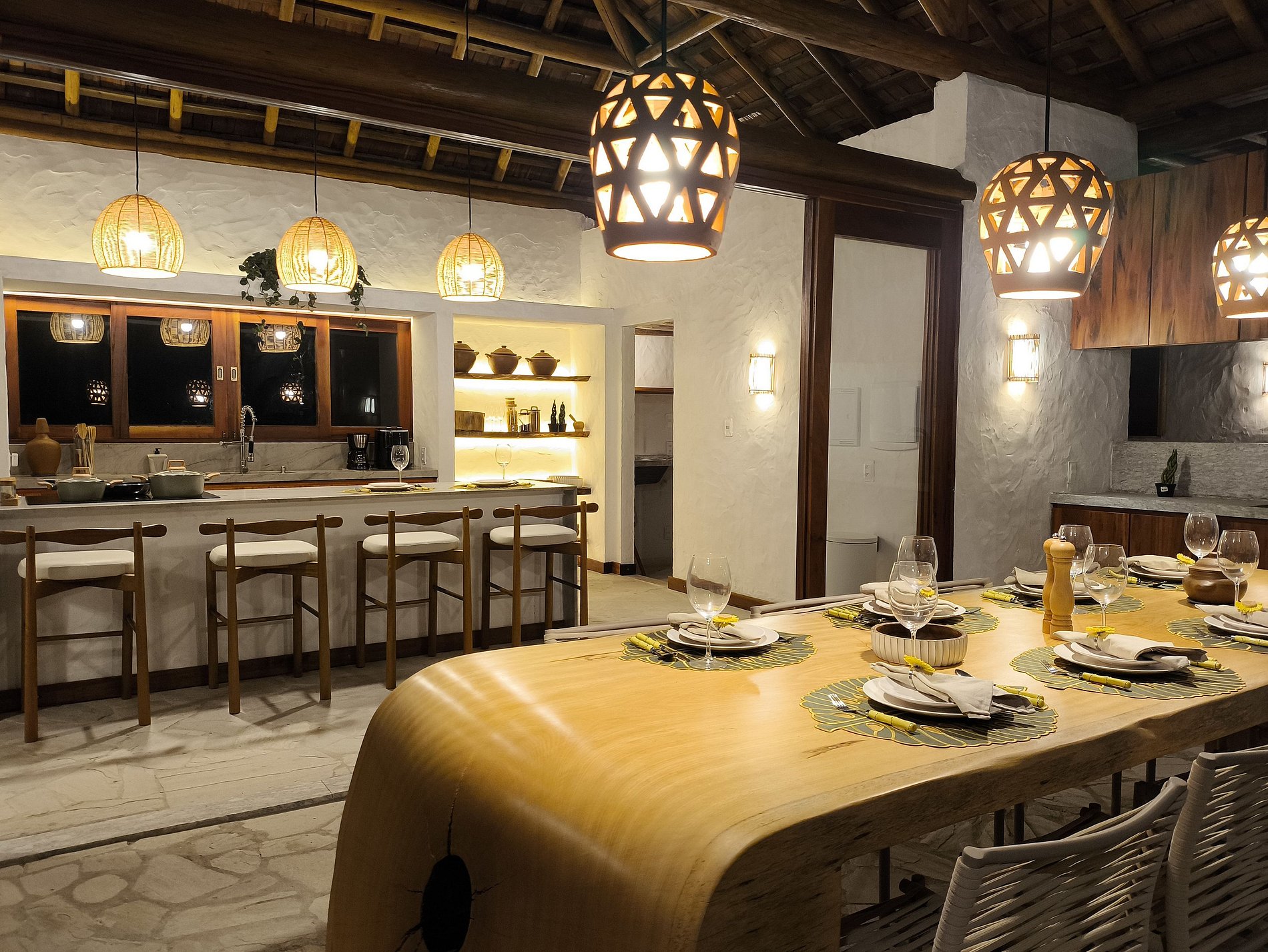 A decoração é leve e natural, inspirada no estilo praiano, com materiais como madeira, fibras, tecidos frescos e cores suaves que remetem à areia, ao mar e ao sol.