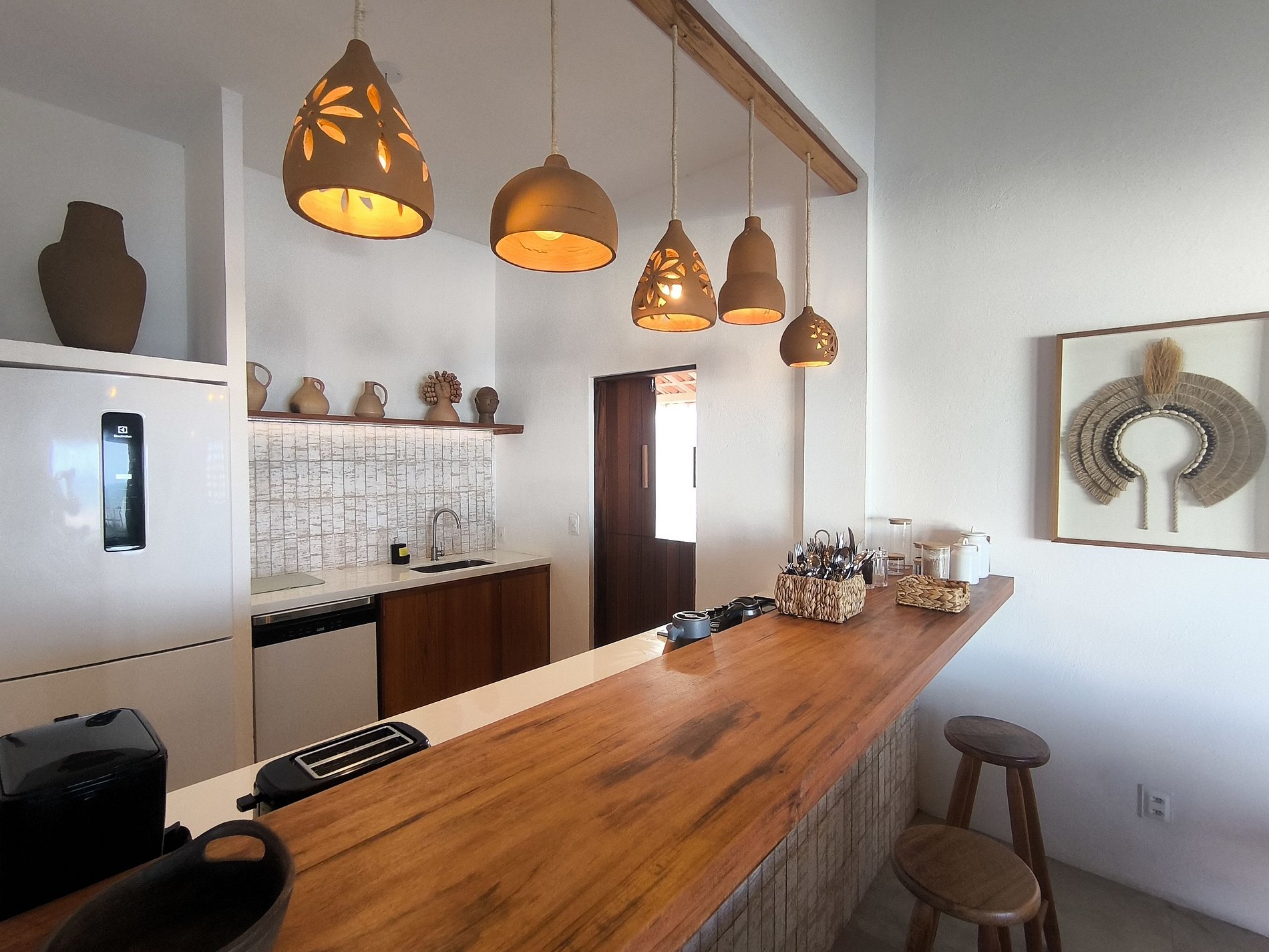 A área externa conta com piscina, churrasqueira e varanda com vista panorâmica, perfeita para relaxar ou confraternizar. A casa possui guarderia exclusiva para equipamentos de surf e kitesurf, ideal para esportistas.
