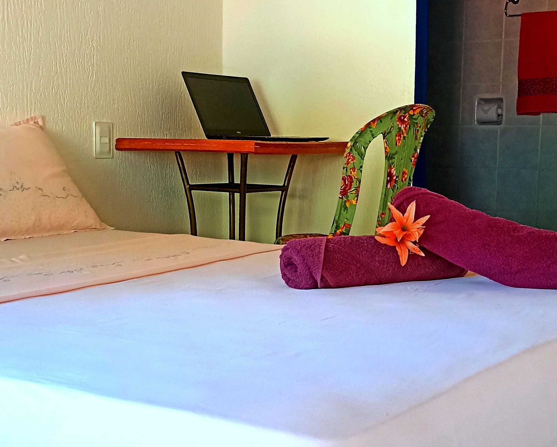Mobiliário rústico, cama de casal, roupa de cama e banho e acesso à internet wi-fi.