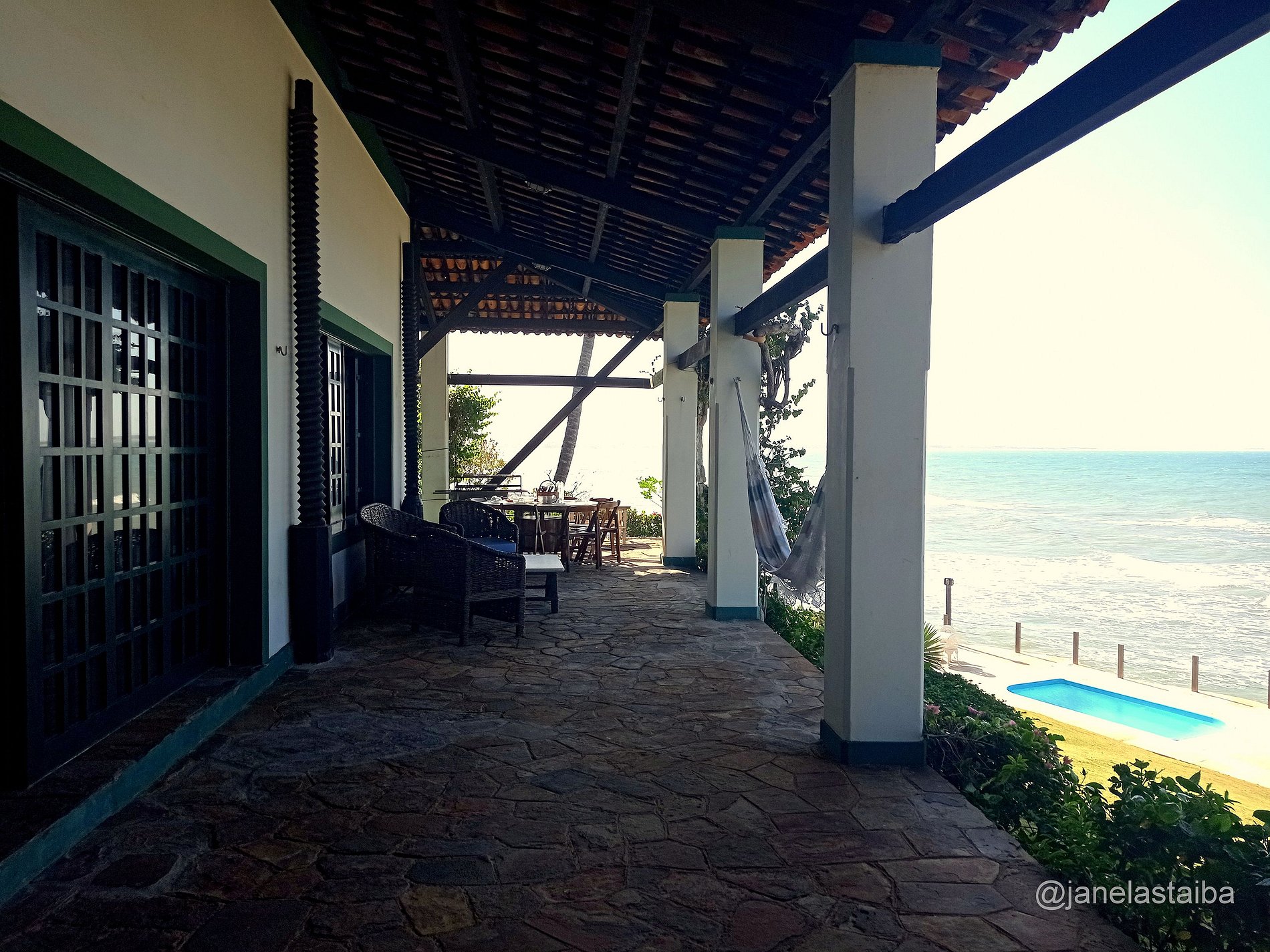 A varanda acompanha praticamente toda a casa. Em um nível abaixo está localizada a piscina, que possui vista para o mar.