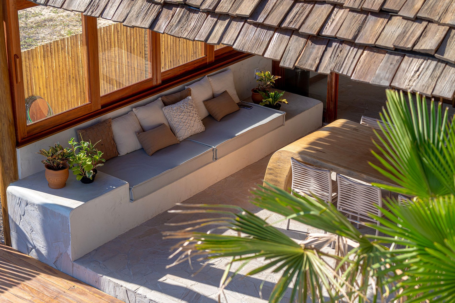 A decoração é leve e natural, inspirada no estilo praiano, com materiais como madeira, fibras, tecidos frescos e cores suaves que remetem à areia, ao mar e ao sol.