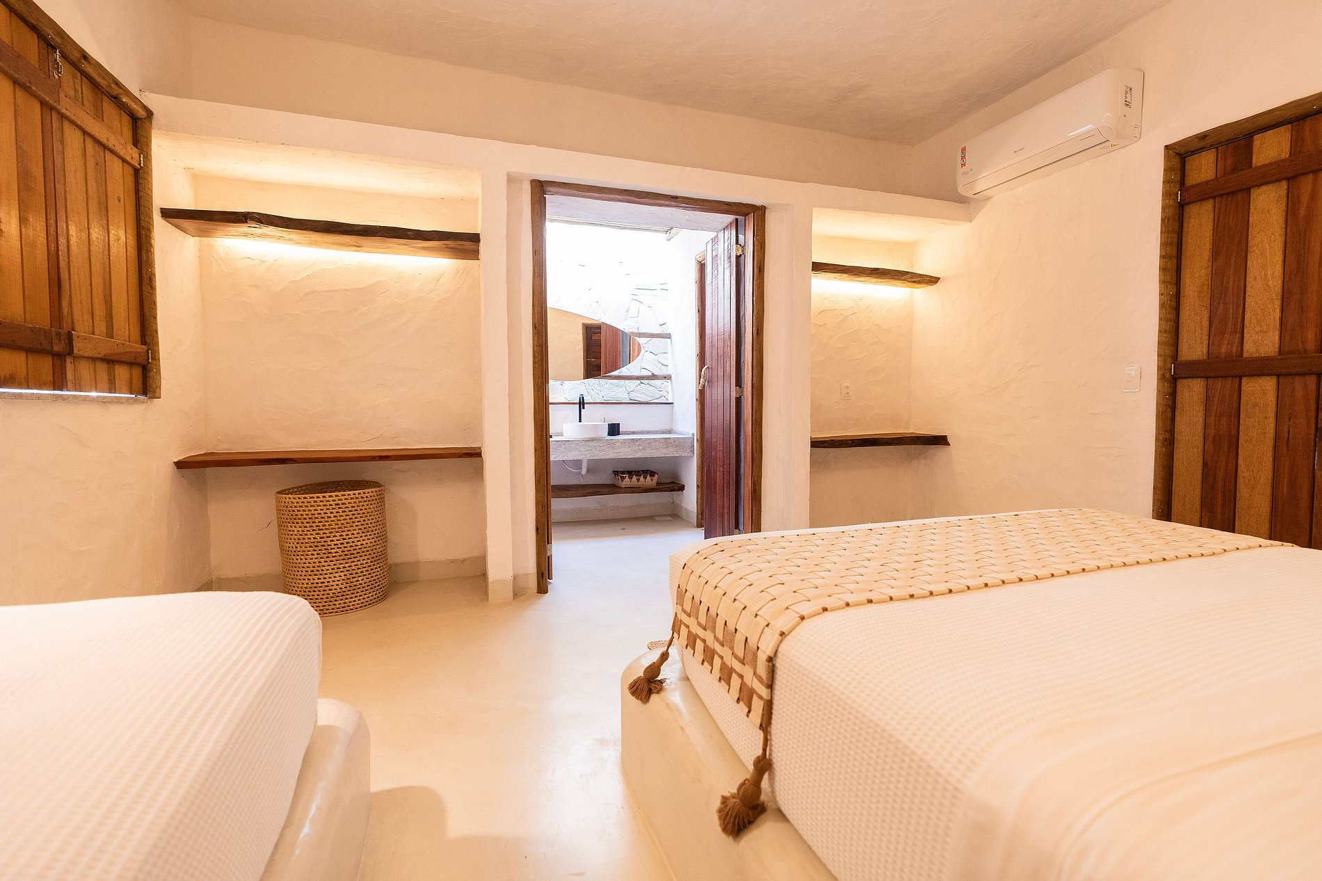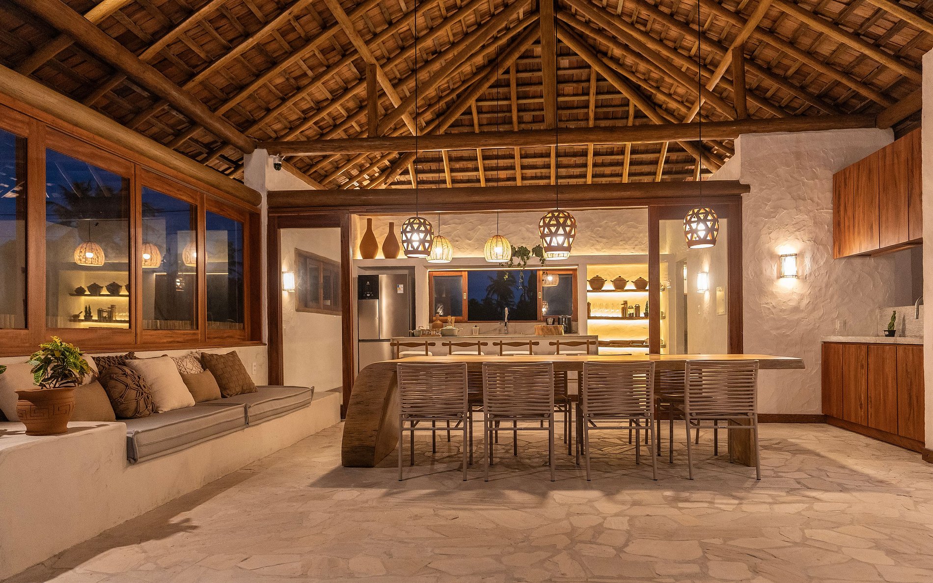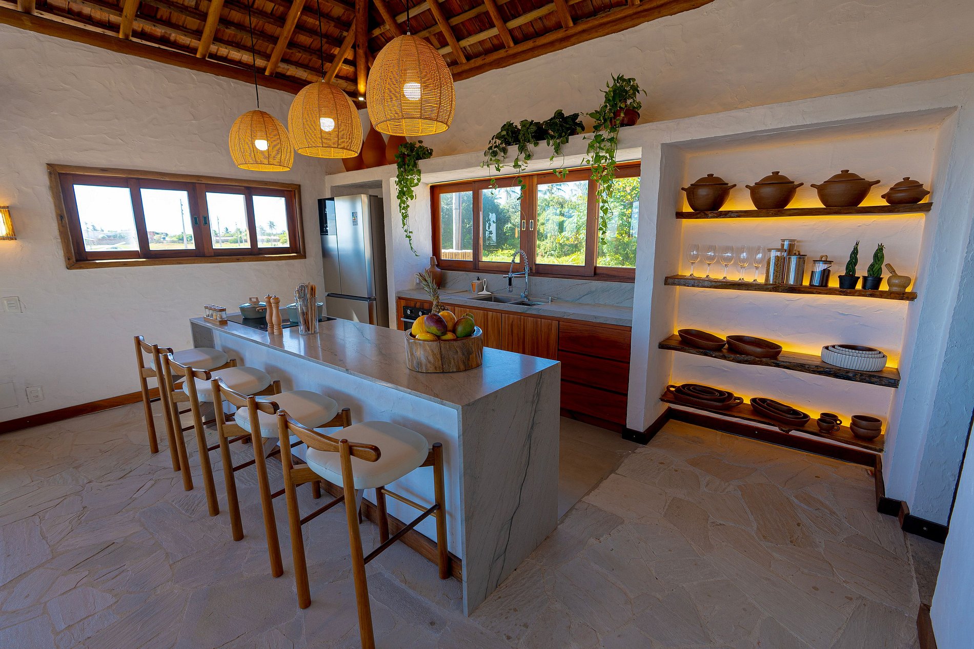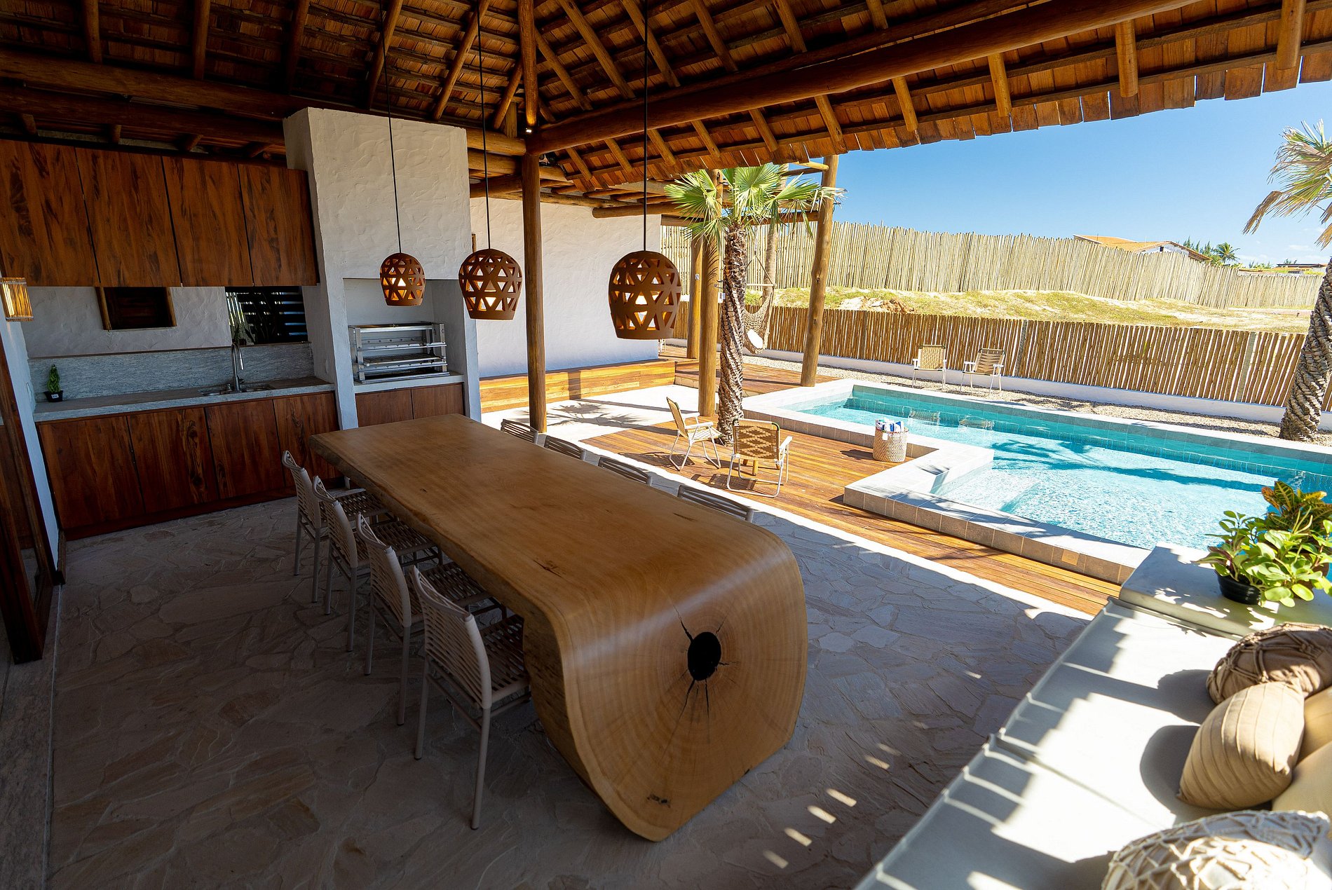 A decoração é leve e natural, inspirada no estilo praiano, com materiais como madeira, fibras, tecidos frescos e cores suaves que remetem à areia, ao mar e ao sol.