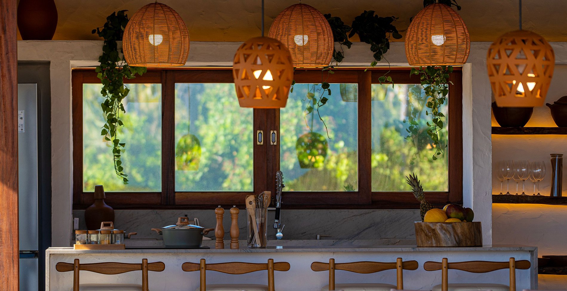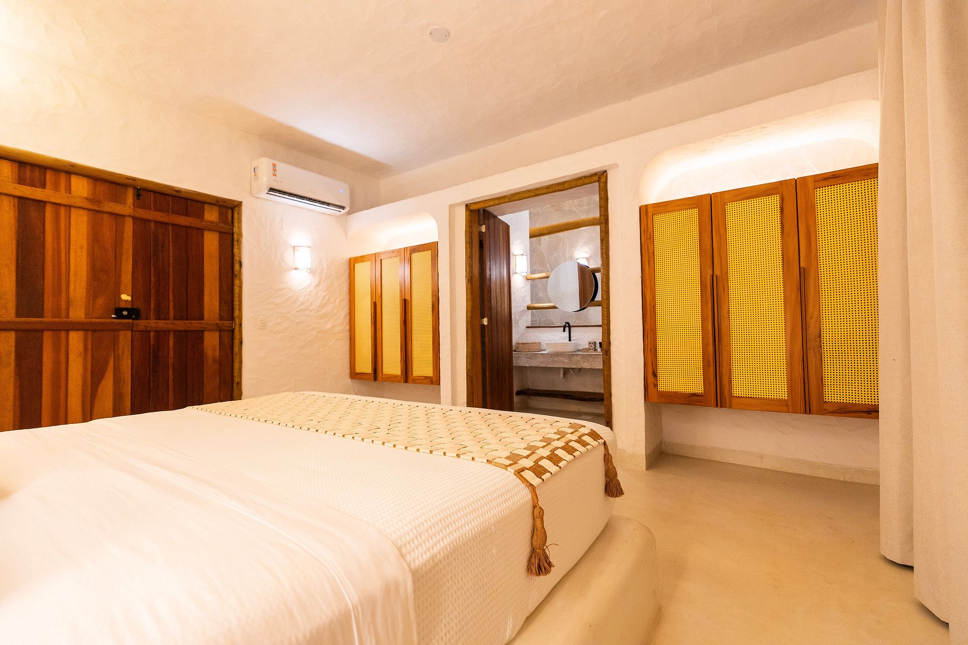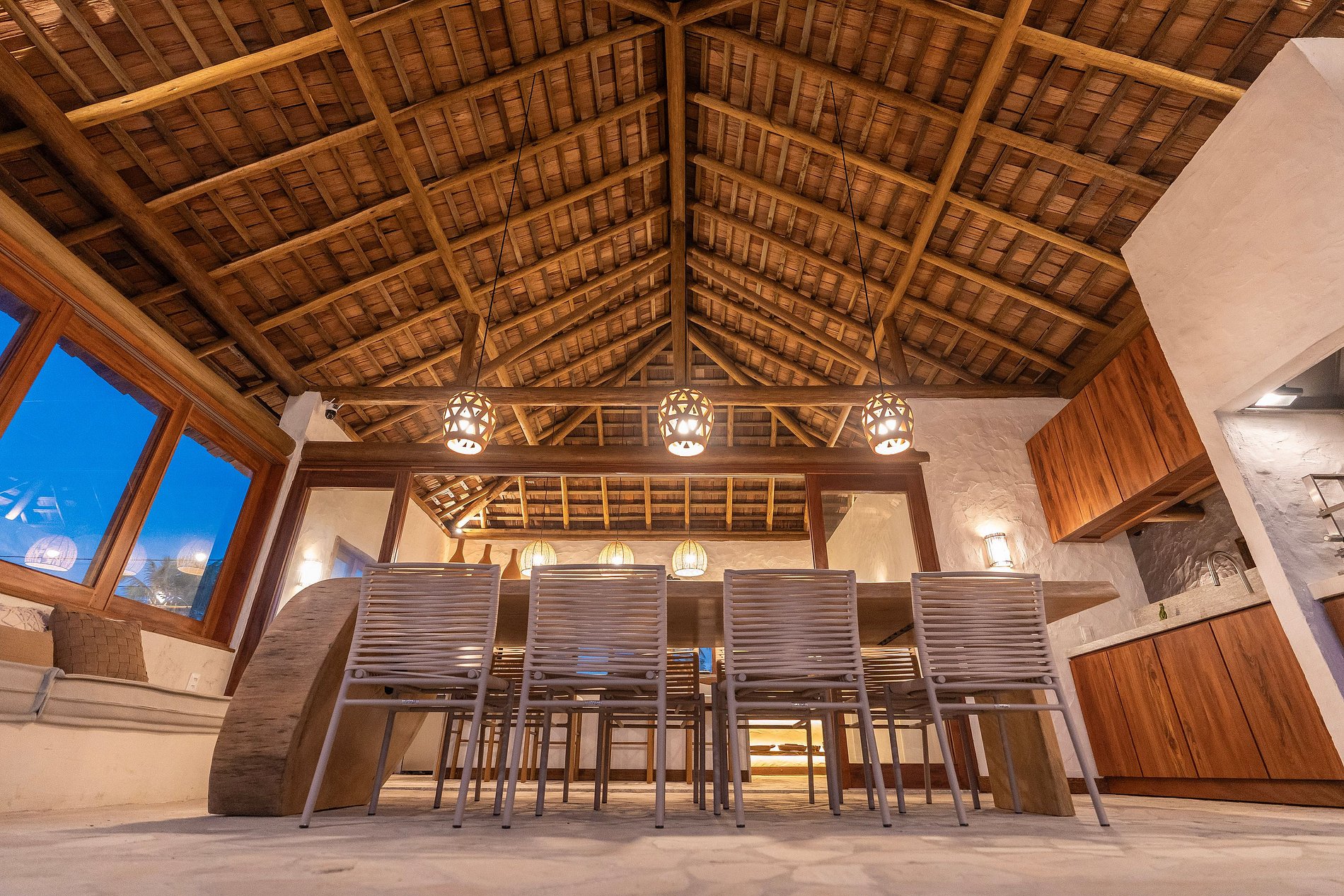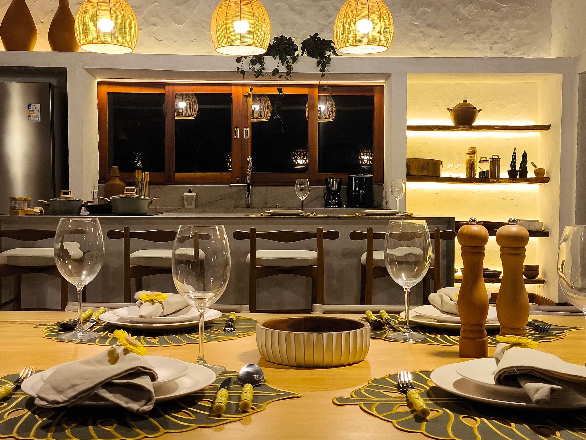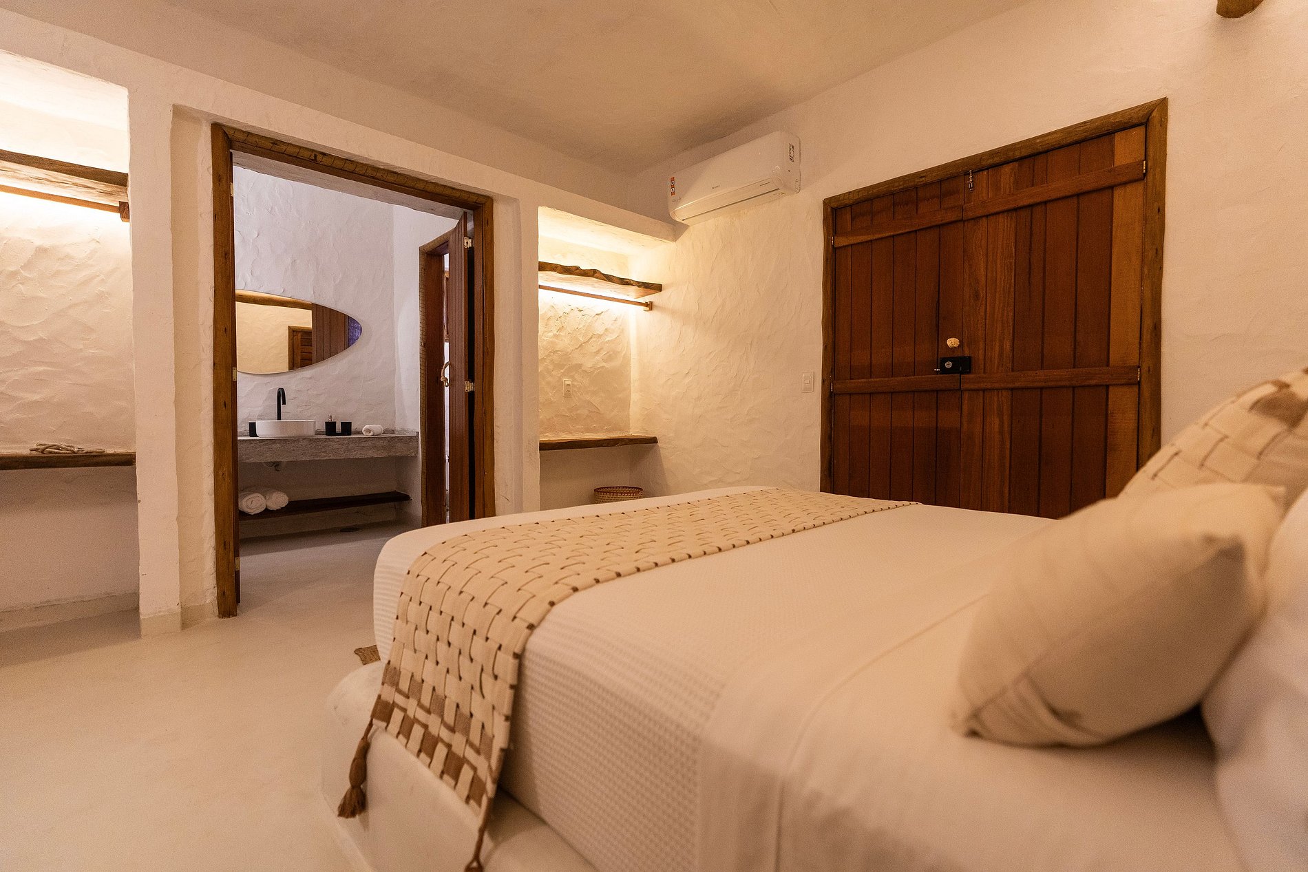 A decoração é leve e natural, inspirada no estilo praiano, com materiais como madeira, fibras, tecidos frescos e cores suaves que remetem à areia, ao mar e ao sol.