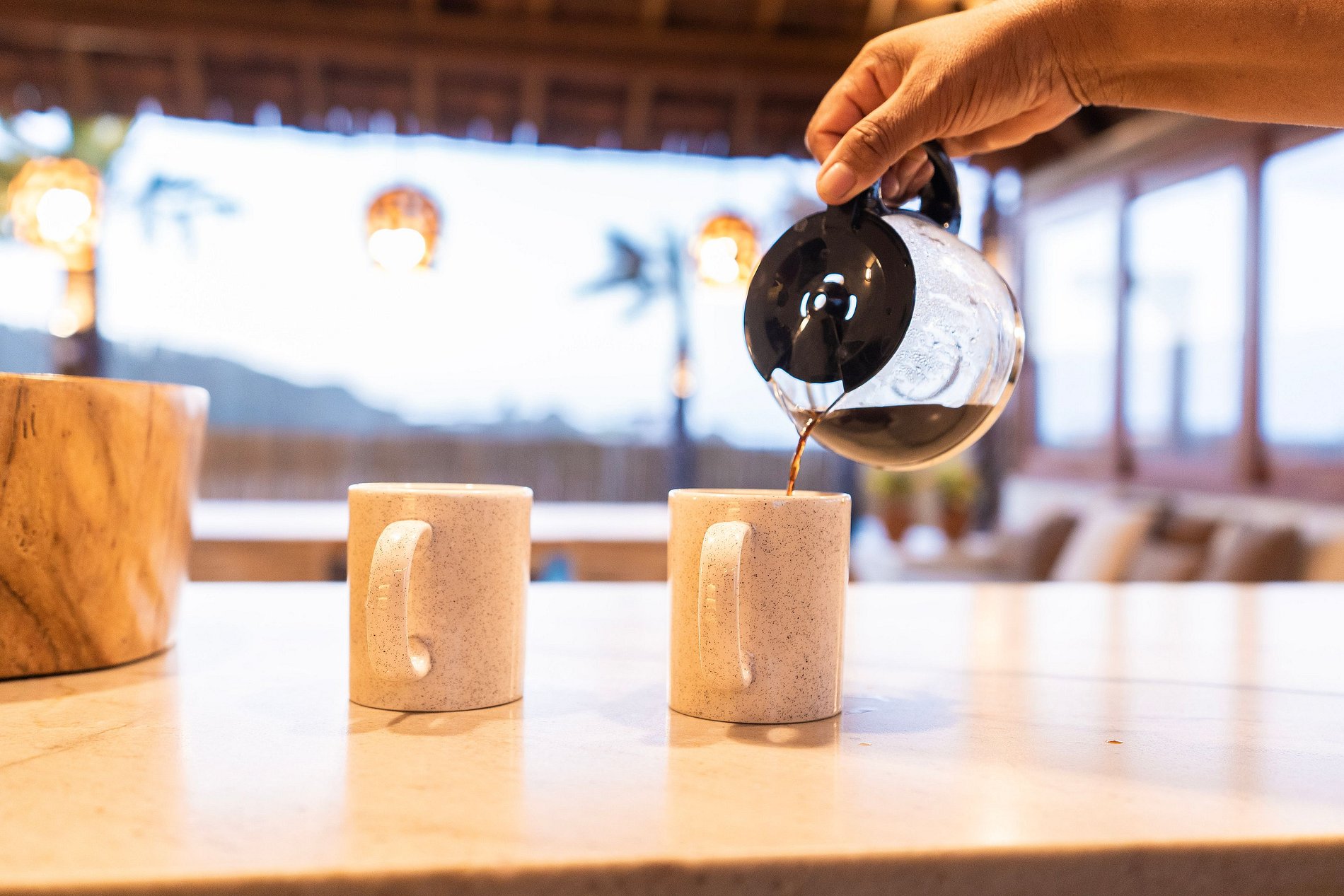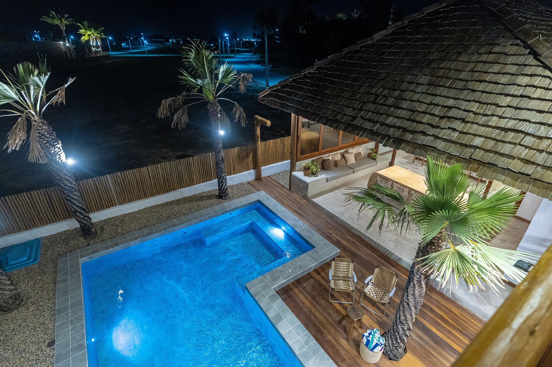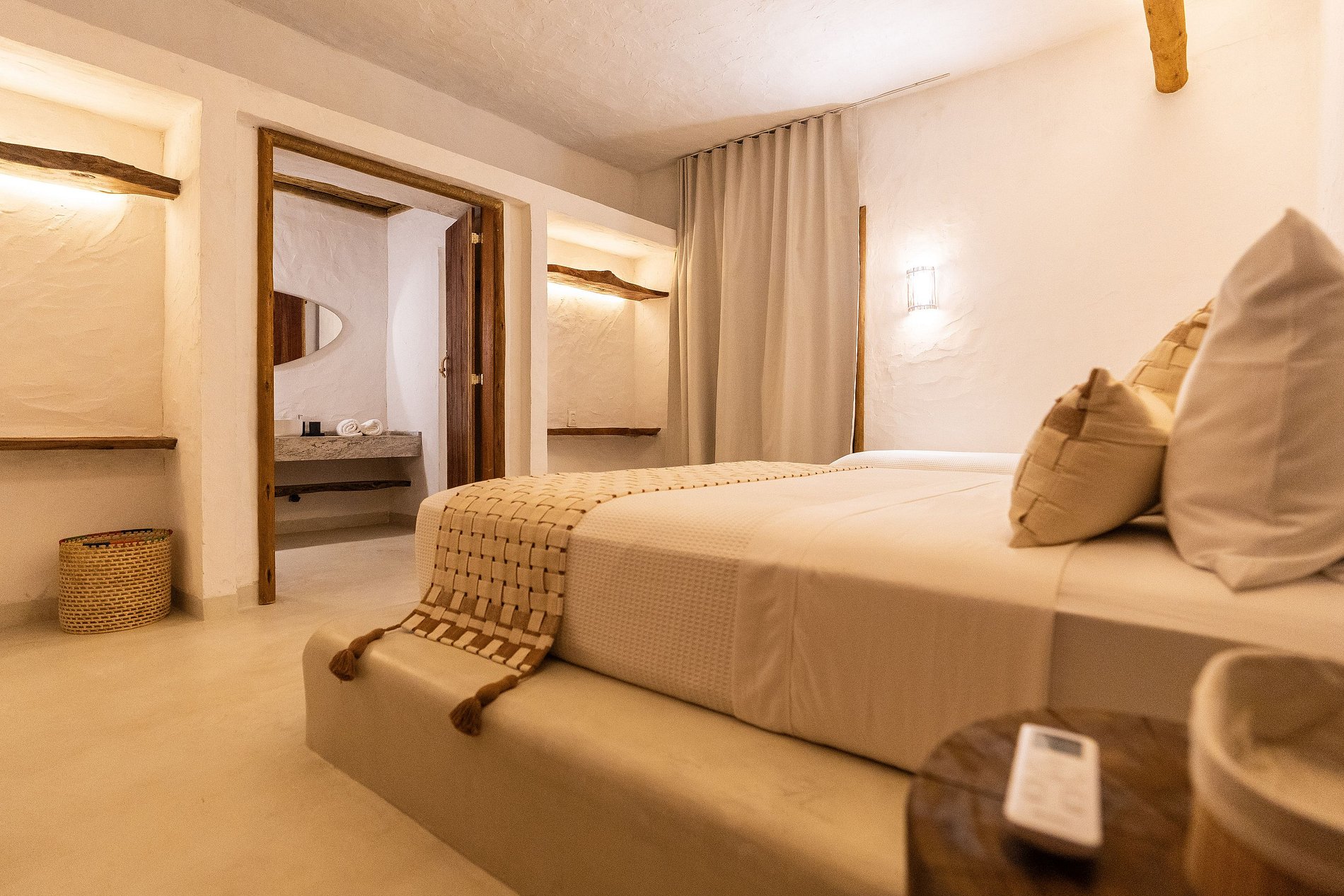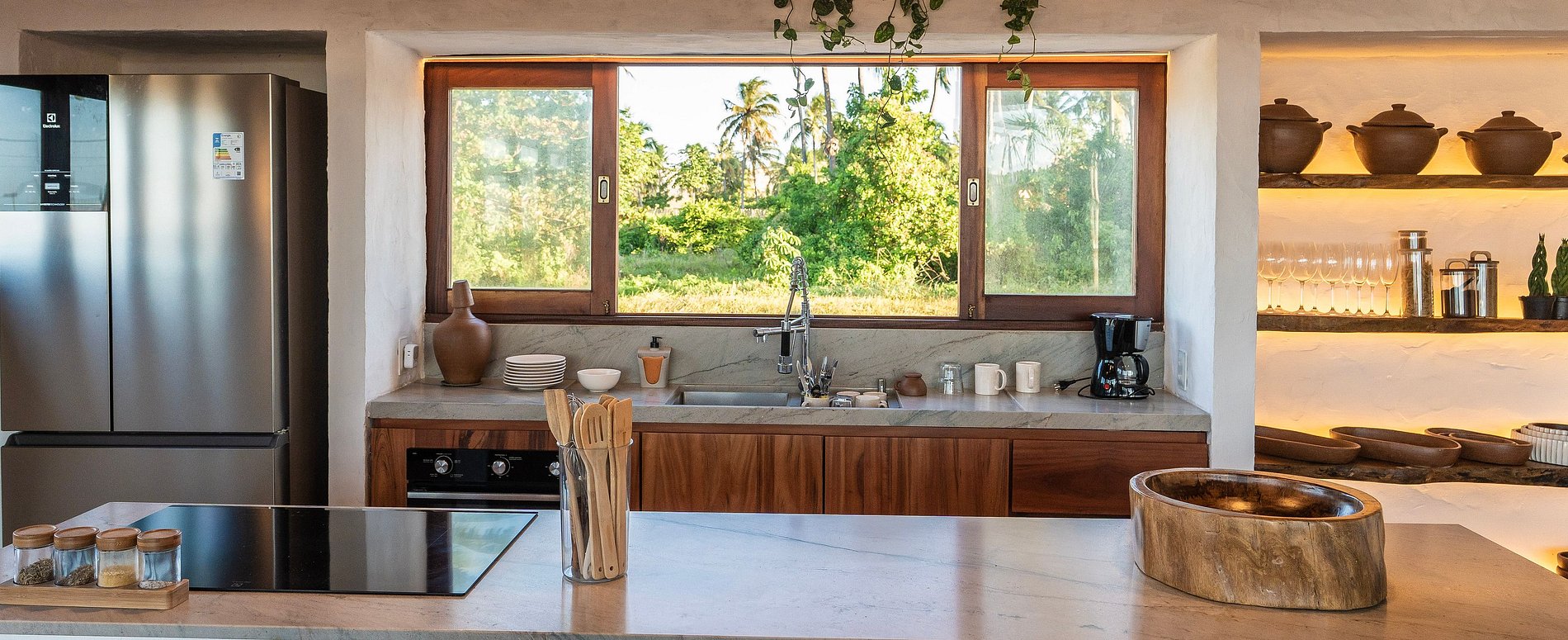 A decoração é leve e natural, inspirada no estilo praiano, com materiais como madeira, fibras, tecidos frescos e cores suaves que remetem à areia, ao mar e ao sol.
