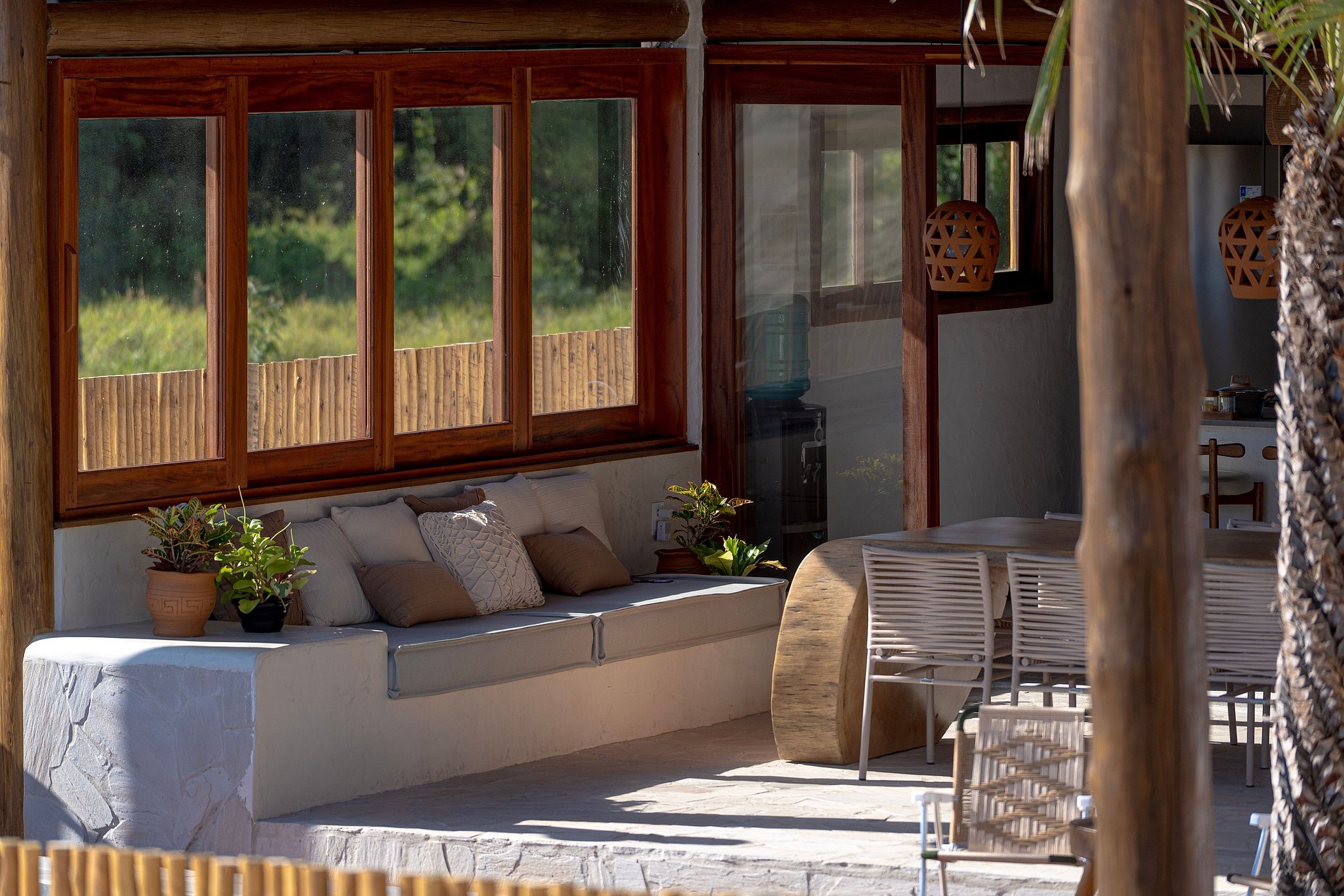 Com piso de madeira, redes e espaço generoso, a varanda é um convite ao descanso. Um lugar para ler sem pressa, almoçar ao som dos pássaros ou simplesmente observar o vento passar entre as folhas.